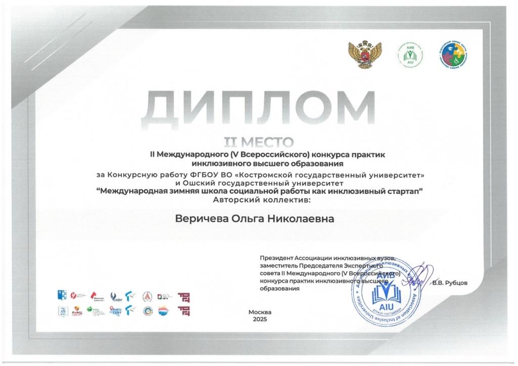Среди 12 лучших практик, отобранных для финала по итогам устной защиты, почётное 2-е место занял совместный проект Костромского и Ошского университетов – «Международная зимняя школа социальной работы как инклюзивный стартап».