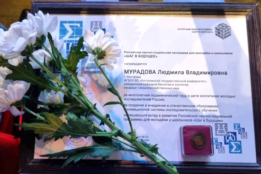 Для торжественного вручения почетного знака программы «Шаг в будущее» была приглашена заведующая кафедрой биологии и экологии Костромского государственного университета Людмила Мурадова.